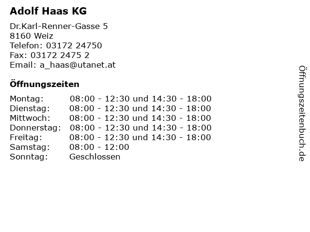 | Öffnungszeiten Adolf Haas KG in Weiz anzeigen | |