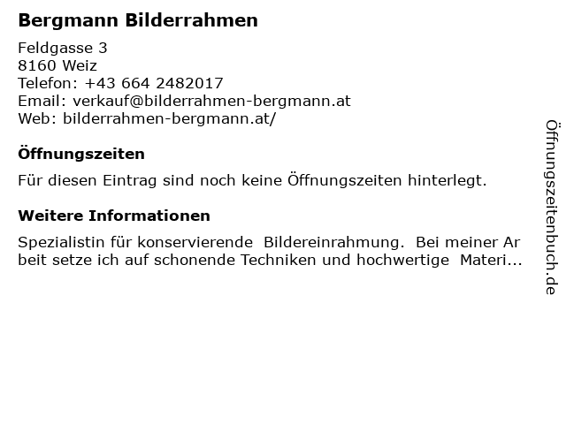 | Öffnungszeiten Bergmann Bilderrahmen in Weiz anzeigen | |