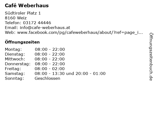 | Öffnungszeiten Café Weberhaus in Weiz anzeigen | |
