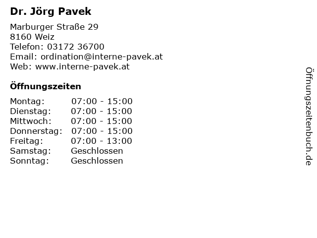 | Öffnungszeiten Dr. Jörg Pavek in Weiz anzeigen | |