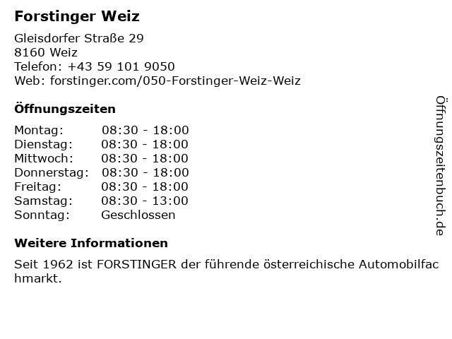| Öffnungszeiten Forstinger Weiz in Weiz anzeigen | |