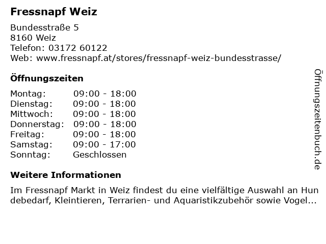 | Öffnungszeiten Fressnapf Weiz in Weiz anzeigen | |
