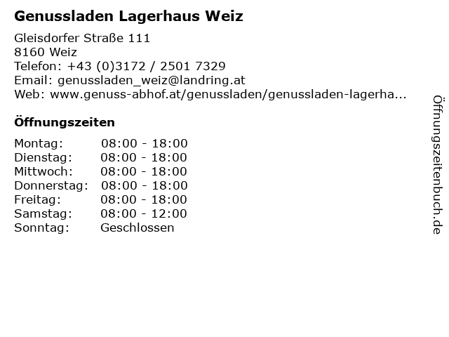 | Öffnungszeiten Genussladen Lagerhaus Weiz in Weiz anzeigen | |