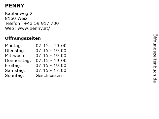 | Öffnungszeiten PENNY in Weiz anzeigen | |