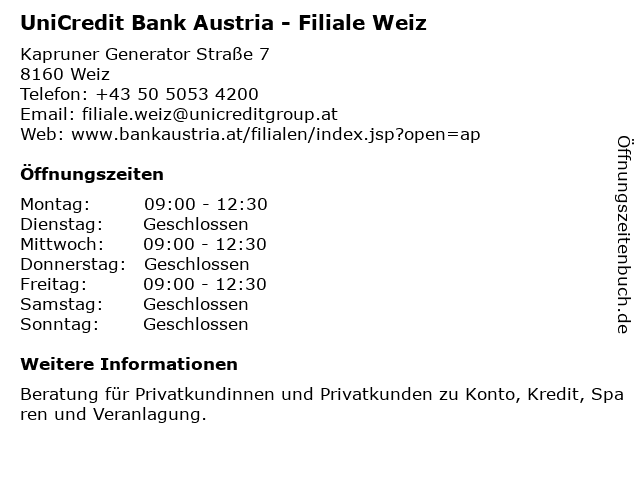 Branchen & Suchbegriffe zu UniCredit Bank Austria - Filiale Weiz:austria, bank, privatkundinnen und privatkunden, unicredit, weiz |