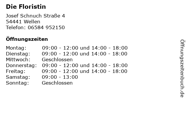 | Öffnungszeiten Die Floristin in Wellen anzeigen | |