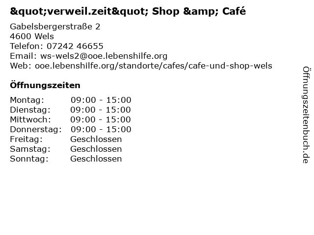 | Öffnungszeiten "verweil.zeit" Shop & Café in Wels anzeigen | |