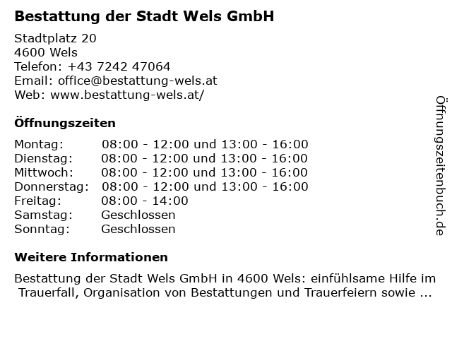 | Öffnungszeiten Bestattung der Stadt Wels GmbH in Wels anzeigen | |