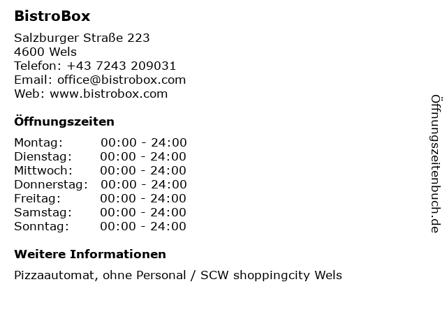 Öffnungszeiten BistroBox in Wels anzeigen | |