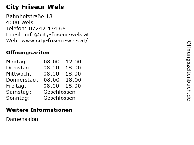 | Öffnungszeiten City Friseur Wels in Wels anzeigen | |