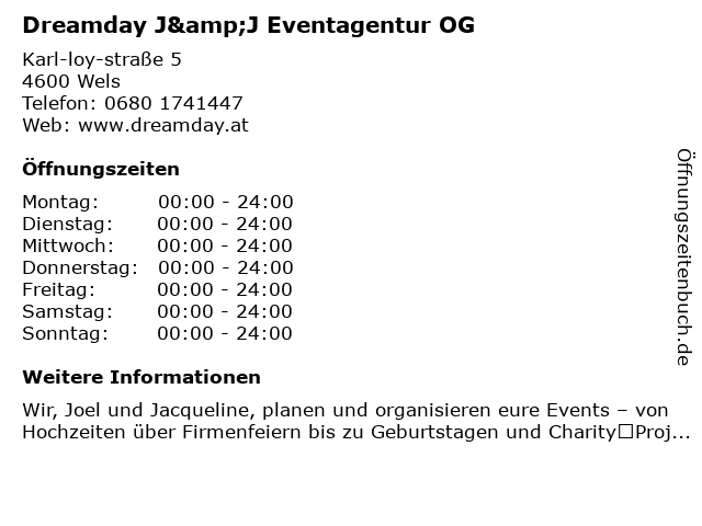 | Öffnungszeiten Dreamday J&J Eventagentur OG in Wels anzeigen | |