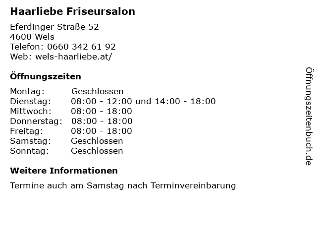 | Öffnungszeiten Haarliebe Friseursalon in Wels anzeigen | |