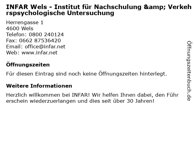| INFAR Wels - Institut für Nachschulung & Verkehrspsychologische Untersuchung anrufen | |