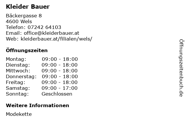 | Öffnungszeiten Kleider Bauer in Wels anzeigen | |