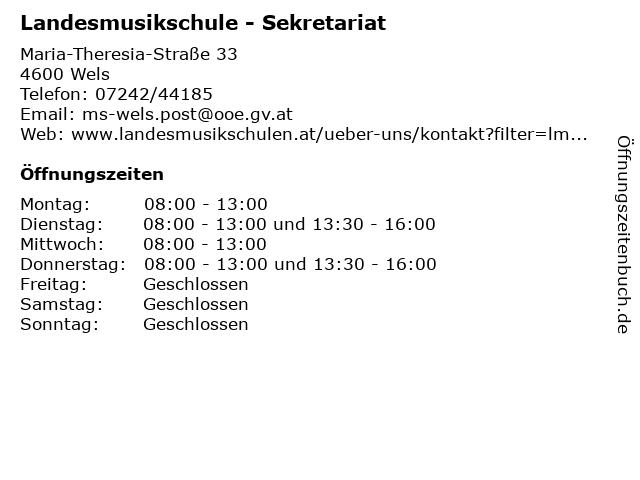 | Öffnungszeiten Landesmusikschule - Sekretariat in Wels anzeigen | |