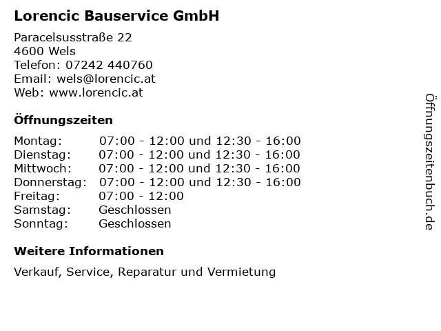 | Öffnungszeiten Lorencic Bauservice GmbH in Wels anzeigen | |