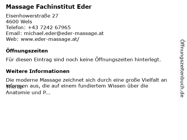 | Öffnungszeiten Massage Fachinstitut Eder in Wels anzeigen | |