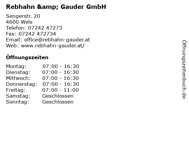 | Öffnungszeiten Rebhahn & Gauder GmbH in Wels anzeigen | |