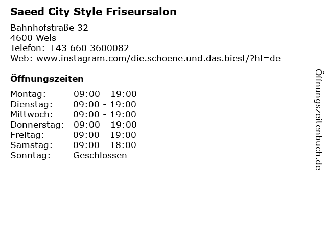 | Öffnungszeiten Saeed City Style Friseursalon in Wels anzeigen | |