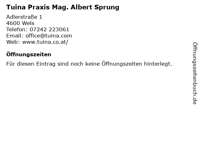 | Öffnungszeiten Tuina Praxis Mag. Albert Sprung in Wels anzeigen | |