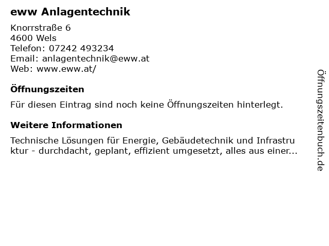 | Öffnungszeiten eww Anlagentechnik in Wels anzeigen | |