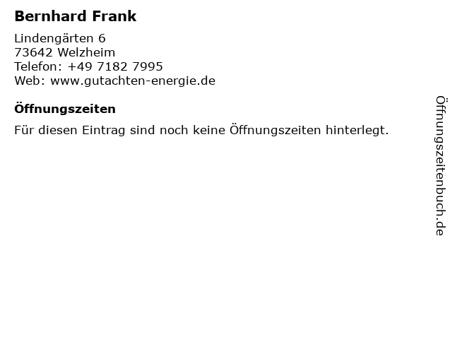 | Öffnungszeiten Bernhard Frank in Welzheim anzeigen | |