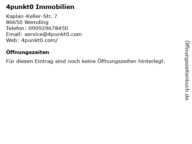 | Öffnungszeiten 4punkt0 Immobilien in Wemding anzeigen | |