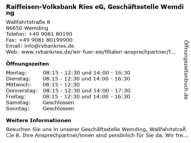 1 Raiffeisen-Volksbank Wemding eG - Hauptstelle Wemding (Entfernung: 0,01 km) Wallfahrtstr. 8, 86650 Wemding 6 Raiffeisen-Volksbank Ries eG Geschäftsstelle Heroldingen (Geldautomat) (Entfernung: 10,23 km) Am Zehenstadtl 9, 86655 Harburg |