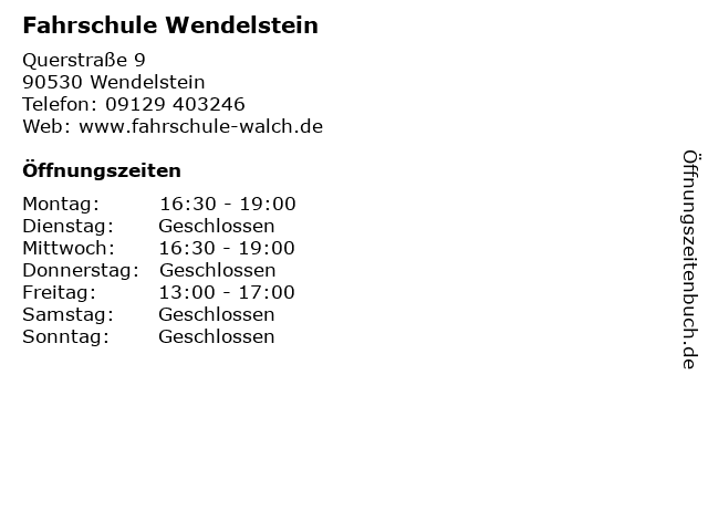 | Öffnungszeiten Fahrschule Wendelstein in Wendelstein anzeigen | |