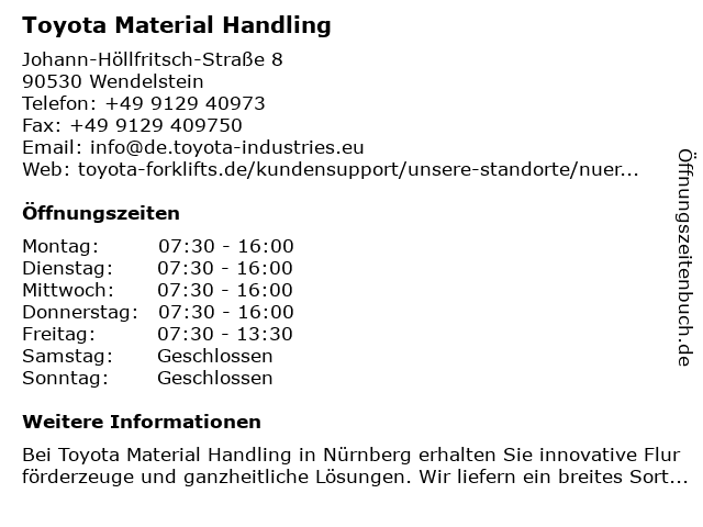 | Öffnungszeiten Toyota Material Handling in Wendelstein anzeigen | |