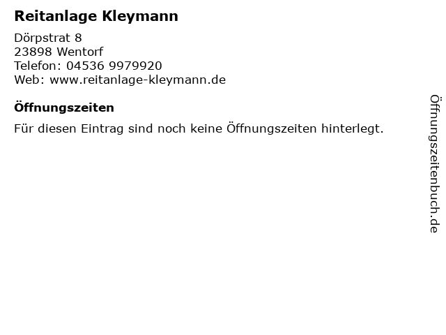 | Öffnungszeiten Reitanlage Kleymann in Wentorf anzeigen | |