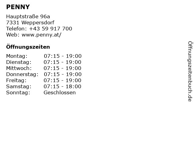 | Öffnungszeiten PENNY in Weppersdorf anzeigen | |
