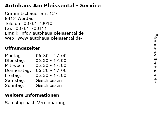 1 Autohaus Am Pleissental GmbH - Werkstatt (Entfernung: 0,92 km) Crimmitschauer Straße 137, 08412 Werdau 2 Wilhelm-Busch-Apotheke im Pleissental, Ulrike Hoffmann (Entfernung: 1,36 km) Crimmitschauer Str. 32, 08412 Werdau 3 Job & Unternehmensberatung Pleissental und (Entfernung: 7,32 km) Thanhofer Str. 6, 08115 Lichtentanne 6 |