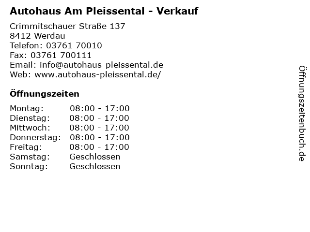 2 Autohaus Am Pleissental GmbH - Werkstatt (Entfernung: 0,92 km) Crimmitschauer Straße 137, 08412 Werdau 3 Wilhelm-Busch-Apotheke im Pleissental, Ulrike Hoffmann (Entfernung: 1,35 km) Crimmitschauer Str. 32, 08412 Werdau 4 Job & Unternehmensberatung Pleissental und (Entfernung: 7,32 km) Thanhofer Str. 6, 08115 Lichtentanne 6 |