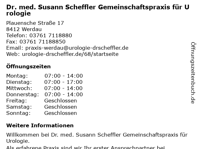 Branchen & Suchbegriffe zu Dr. med. Susann Scheffler Gemeinschaftspraxis für Urologie:dr., gemeinschaftspraxis, med., scheffler, susann, urologie |