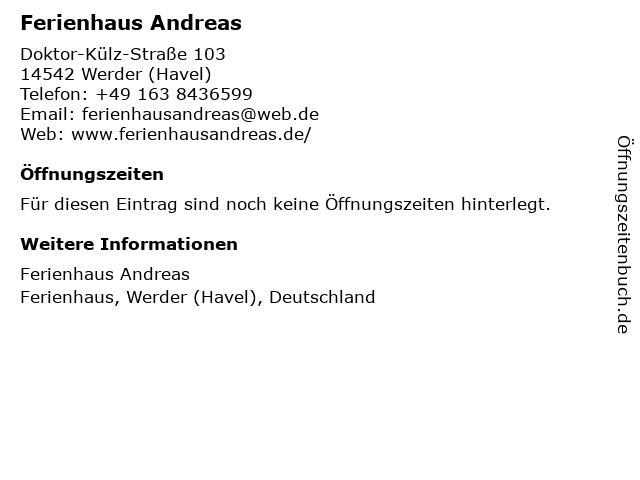 | Öffnungszeiten Ferienhaus Andreas in Werder (Havel) anzeigen | |