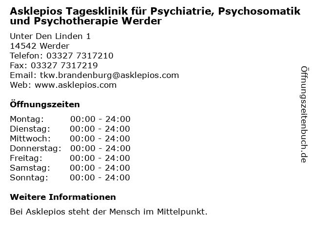 Branchen & Suchbegriffe zu Asklepios Tagesklinik für Psychiatrie, Psychosomatik und Psychotherapie Werder:asklepios, psychiatrie, psychosomatik, psychotherapie, tagesklinik |