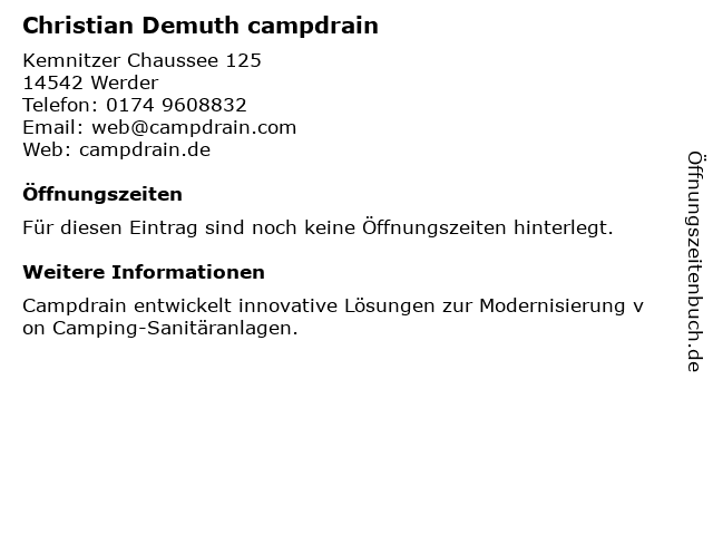 | Öffnungszeiten Christian Demuth campdrain in Werder anzeigen | |