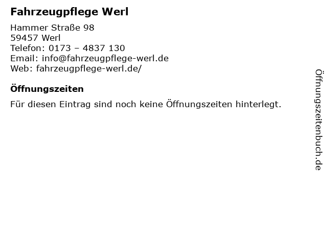 | Öffnungszeiten Fahrzeugpflege Werl in Werl anzeigen | |