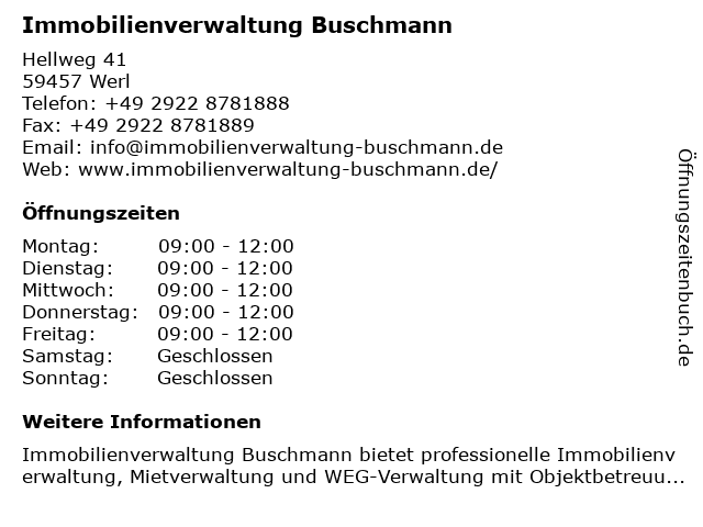 | Öffnungszeiten Immobilienverwaltung Buschmann in Werl anzeigen | |
