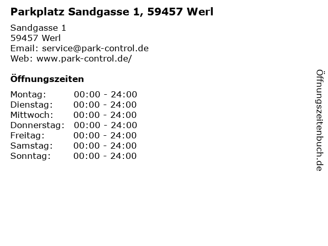| Öffnungszeiten Parkplatz Sandgasse 1, 59457 Werl in Werl anzeigen | |