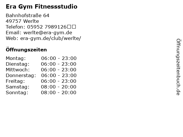 | Öffnungszeiten Era Gym Fitnessstudio in Werlte anzeigen | |