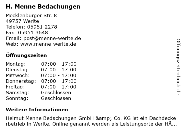 | Öffnungszeiten H. Menne Bedachungen in Werlte anzeigen | |