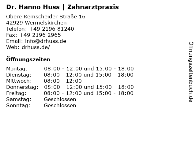 1 Zahnarztpraxis Dr. Matthias Feyka & Andreas Dufhaus (Entfernung: 0,46 km) Thomas-Mann-Str. 35, 42929 Wermelskirchen 6 |