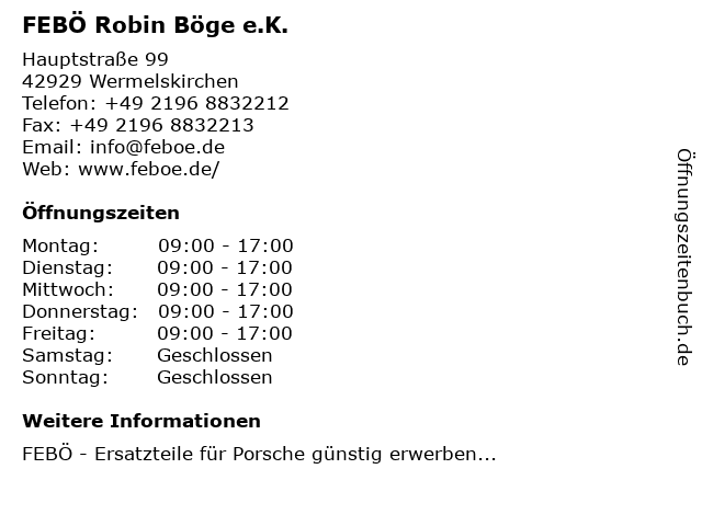 | Öffnungszeiten FEBÖ Robin Böge e.K. in Wermelskirchen anzeigen | |