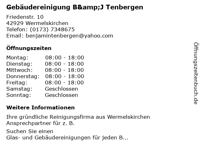 1 Claas Freddy Dienstleistungen Gebäudereinigung (Entfernung: 0,66 km) Südstr. 21, 42929 Wermelskirchen 6 Sait Akagündüz Reinigung von Industriemaschinen Gebäudereinigung (Entfernung: 8,99 km) Gerichtstr. 9, 42651 Solingen |