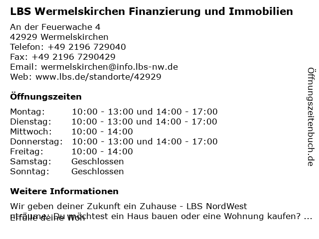 1 3 LBS Radevormwald Finanzierung und Immobilien (Entfernung: 12,47 km) Carl-Diem-Straße 2A, 42477 Radevormwald 4 LBS Westdeutsche Landesbausparkasse Bausparen-Finanzieren-Altersvorsorge-Kunden-Center (Entfernung: 13,89 km) Morianstr. 14, 42103 Wuppertal 5 LBS Wuppertal Barmen Finanzierung und Immobilien (Entfernung: 14,59 km) Lindenstraße 8, 42275 Wuppertal 6 |
