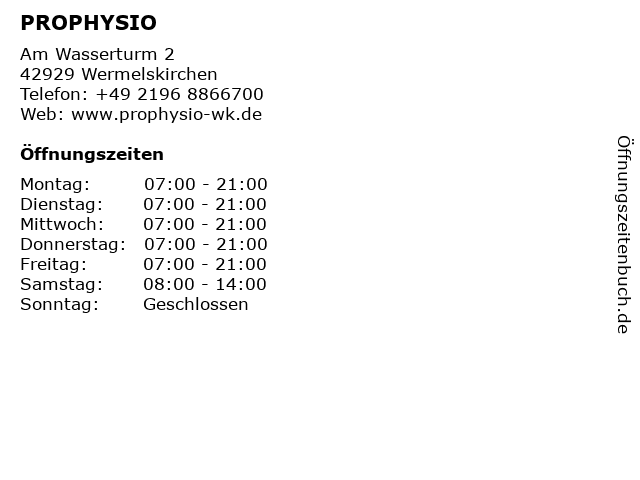 | Öffnungszeiten PROPHYSIO in Wermelskirchen anzeigen | |