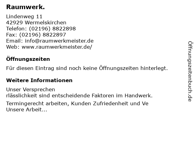 Öffnungszeiten Raumwerk. in Wermelskirchen anzeigen | |