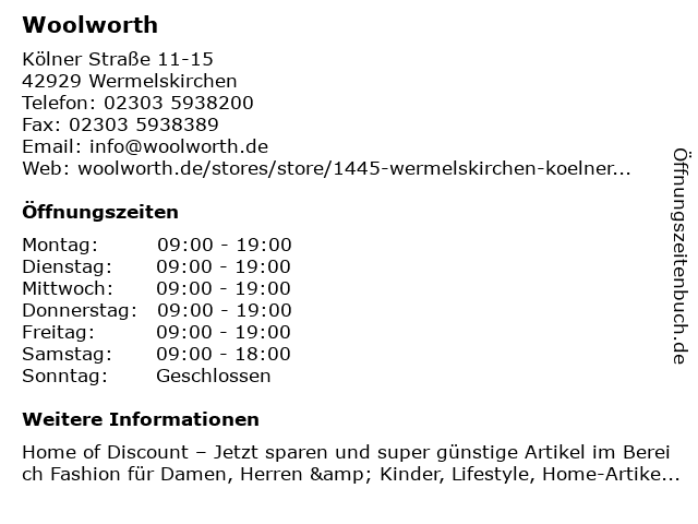 | Öffnungszeiten Woolworth in Wermelskirchen anzeigen | |